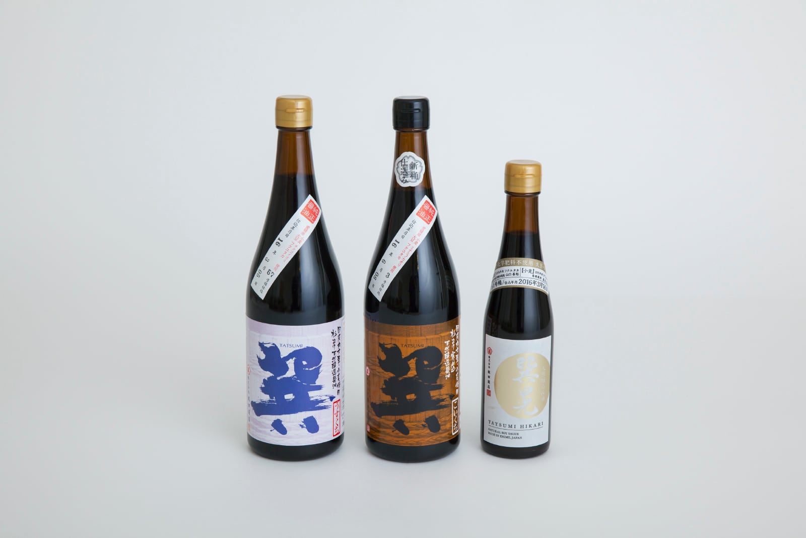 ウェブショップでは720mlの濃口醤油(写真中央)と淡口醤油(写真左)を販売しています。